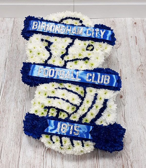 Based in double white chrysanthemum sprayed royal blue where necessary. Silver letters complete the tribute.
