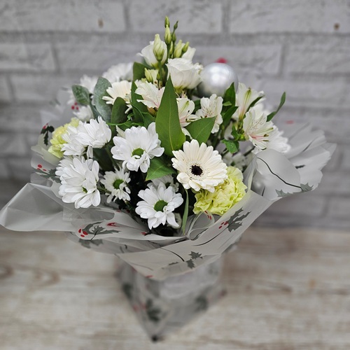 An Aqua hand tied bouquet in shades of white and green including carnations, alstroemeria, chrysanthemums, gerbera and foliage finished with a bauble and a sprinkle of glitter. Presented in a festive box.
