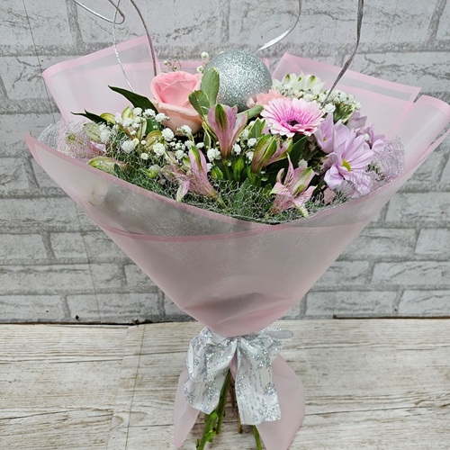 Hand tied bouquet. Arranged and presented in cellophane in shades of soft pinks and white including foliage and silver baubles with a bit of silver sparkle.