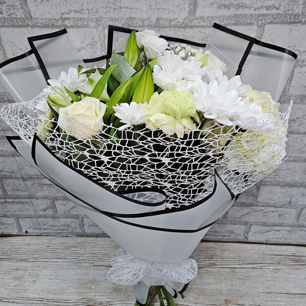 A hand tied bouquet with a selection of white flowers chose by our florist to meet your budget,