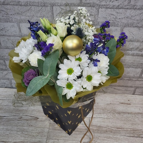 Aqua hand tied bouquet presented in a gift bag and arranged in a bubble of water. A selection of midnight purples and white flowers with a splash of gold.