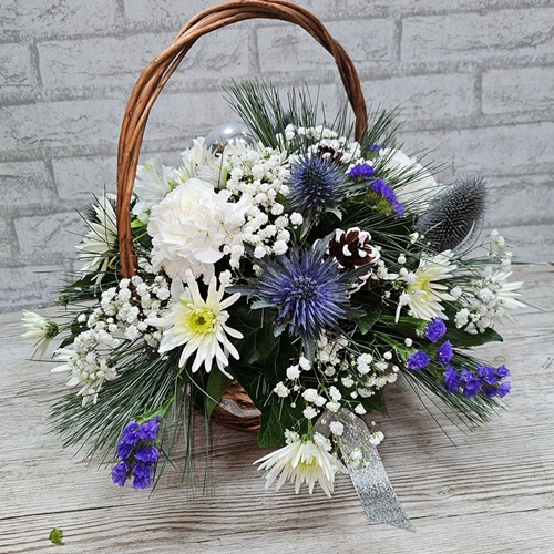 This round basket includes blue and white flowers, to create the winter Christmas look