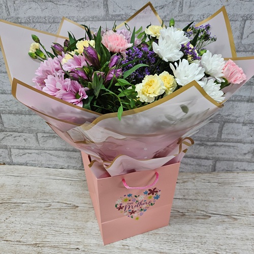 A lovely selection of pink white purple and lemon flowers, chose by our florists and presented in a happy mothers day gift bag.