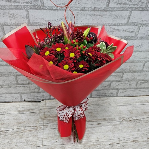 Hand tied bouquet. Arranged and presented in cellophane with a mixture of red, white and a hint of soft pinks and foliage’s